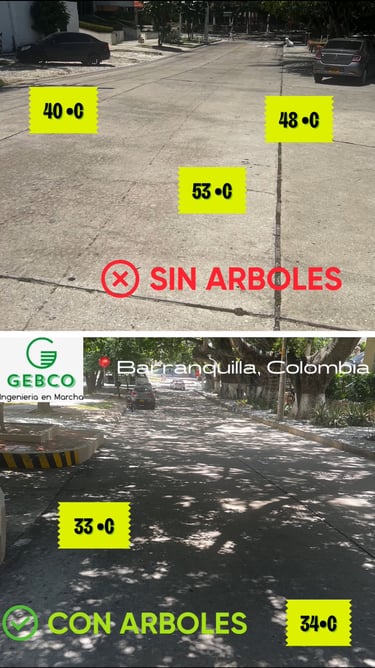 Recientemente, llevé a cabo un estudio utilizando una cámara termográfica para analizar las temperaturas en las calles de Barranquilla. Los resultados fueron sorprendentes : una diferencia de hasta 20 grados Celsius entre una calle con árboles y otra sin árboles. Esto muestra el poder transformador de la vegetación en nuestra ciudad.